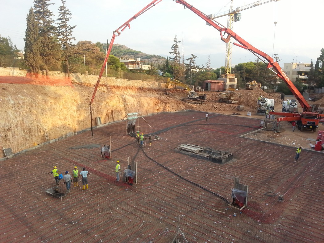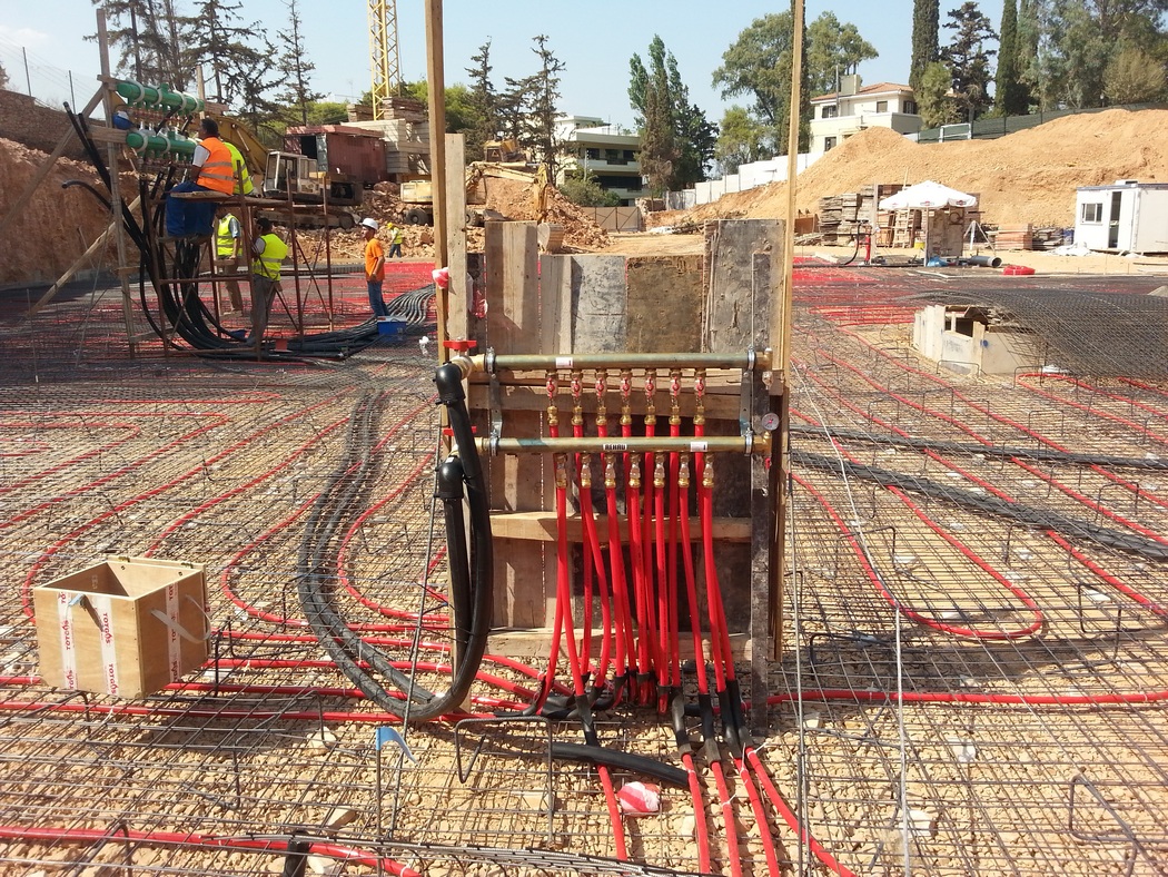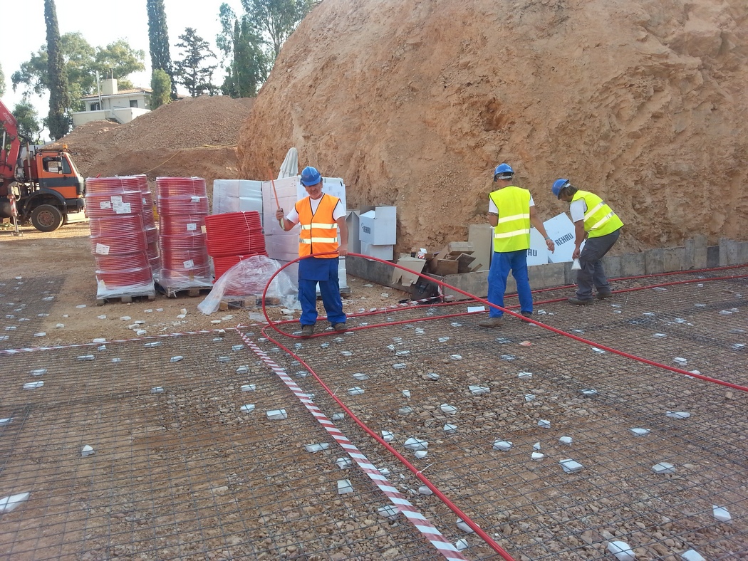 Η μελέτη των Η/Μ του έργου έχει εκπονηθεί απο το γραφείο του κ. Αλέξανδρου Καμαρινού και προβλέπει την εγκατάσταση 7.000 μέτρων σωληνώσεων Rehau Pex-a, κάτω απο τα θεμέλια του κτιρίου.