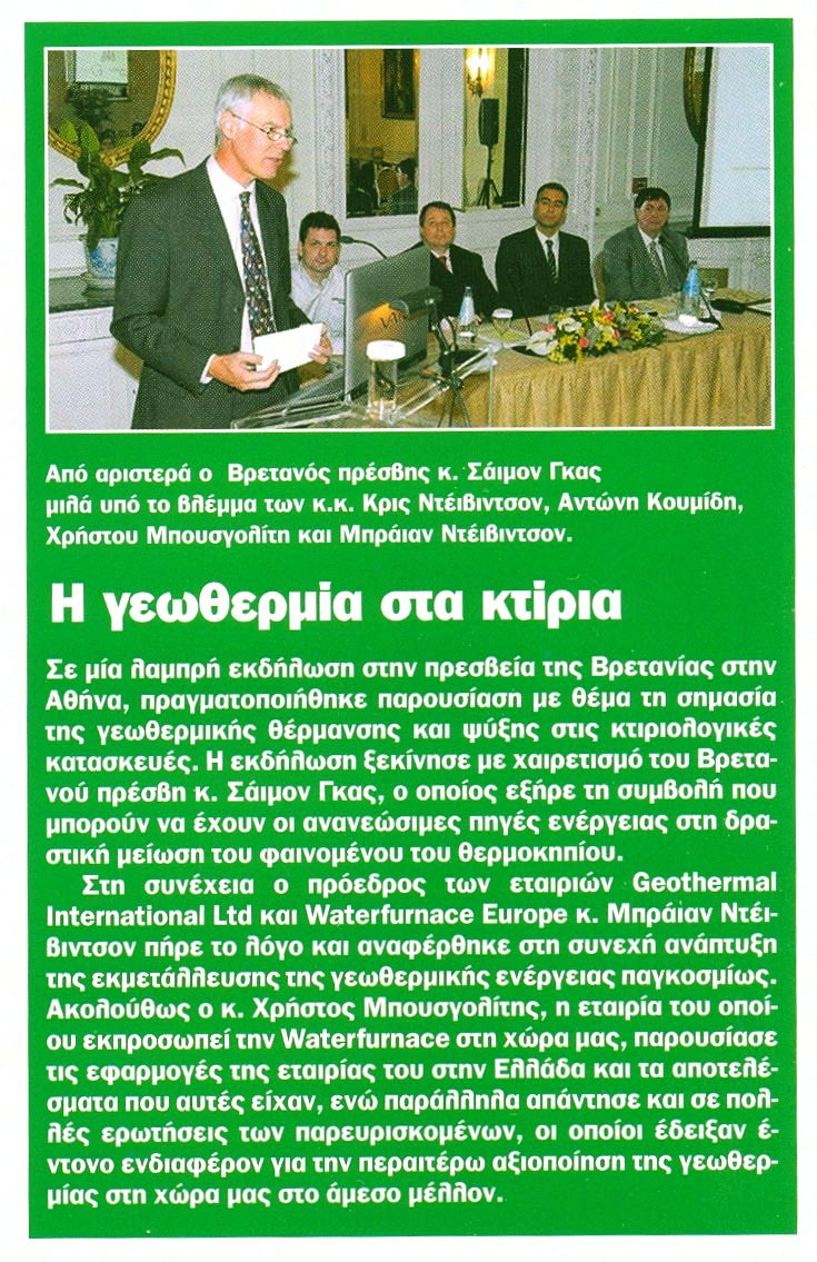 Απόσπασμα από το περιοδικό Ecotec για την εκδήλωση της WaterFurnace για τη γεωθερμία στην Βρετανική Πρεσβευτική Κατοικία.